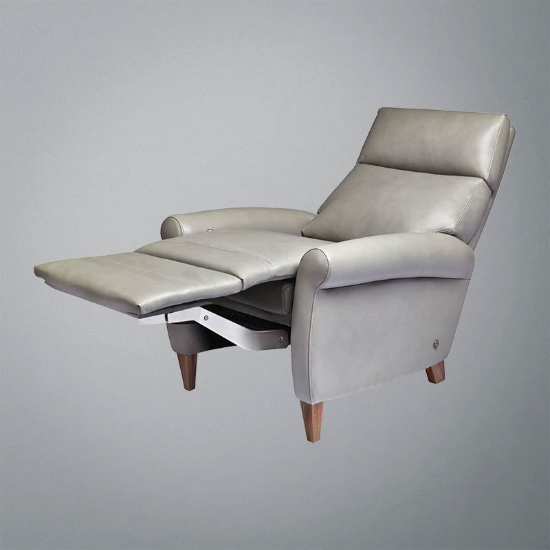 The Adley features a patented reclining mechanism, with a footrest and back that operate independently. Choose from a swivel-base available in Brushed Metal or solid wood base in Natural Walnut or Gray Ash. Stationary legs are also available in Natural Walnut or Gray Ash. Make the Adley yours with choice of any leather, fabric — including performance options — or bring your own covering.