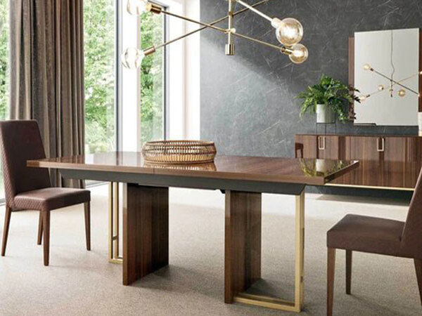 It is made with function and classy design in mind. Alte dining set is made in brown walnut High Gloss lacquer with a perfectly matching golden finish used for the metal parts.