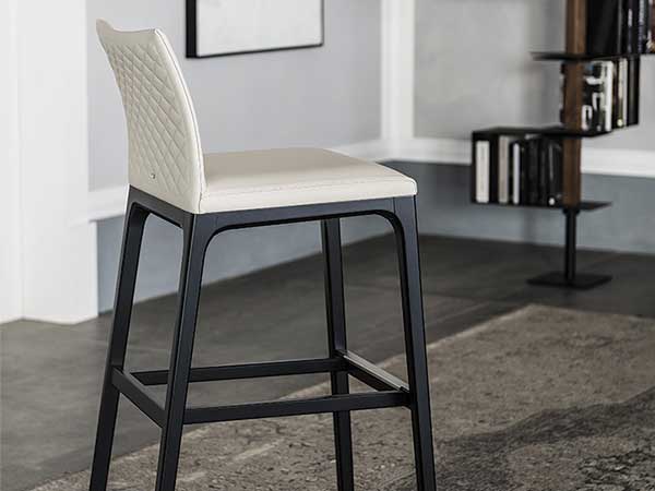 Stool with frame in natural beech (F1), Canaletto walnut (FNC), wenghè (FW), matt white (OP7) or black (OP17) stained beech. Cover in synthetic leather or soft leather as per sample card. Quilted seatback cover. The cover is not removable.