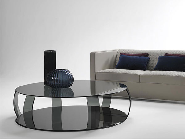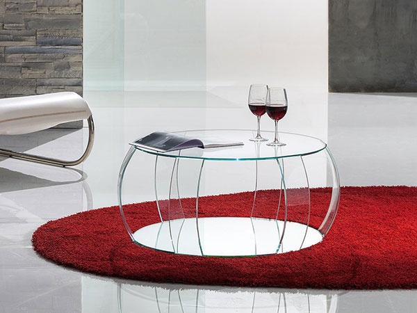 Collection of coffee and side tables in curved extraclear glass 10 mm thick in barrel shape with transparent top and bottom discs in mirror glass.