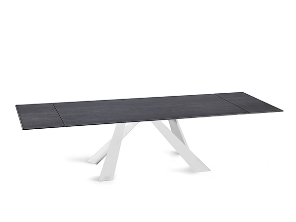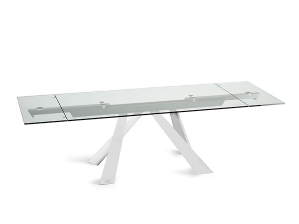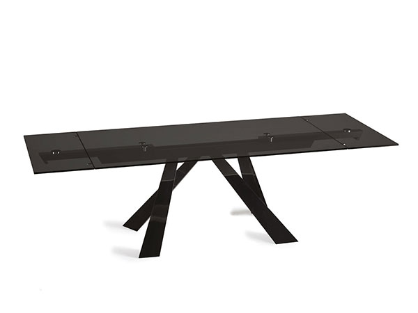 EXTENSIBLE DINING TABLE WITH GLASS TOP AND EXTENSIONS. LEGS IN BLACK NICKEL, CHROMED OR PAINTED FINISHING. A VERY EASY MECHANISM IN PAINTED ALUMINIUM TO PULL OUT THE EXTENSIONS ALLOWS THE WIDENINGS OF THE TOP OF CM 80.