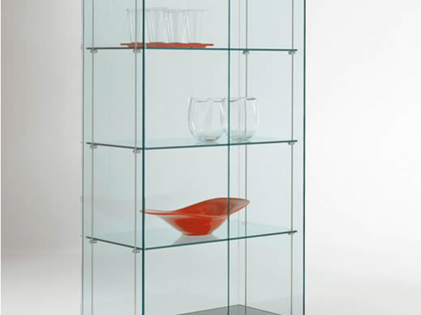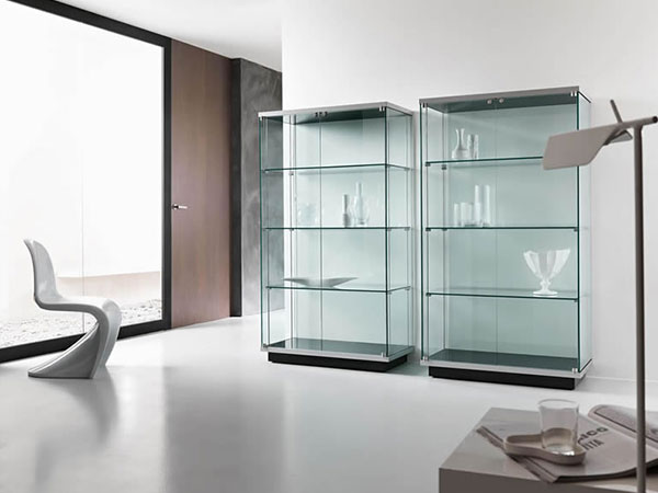 Tempered glass showcase. Base and top in white or black lacquered wood. Optional lighting kit.