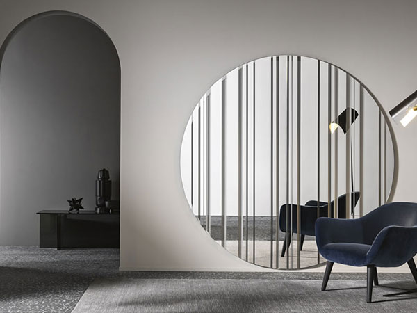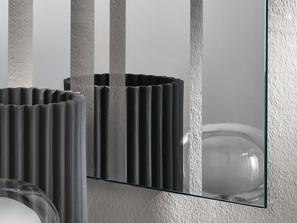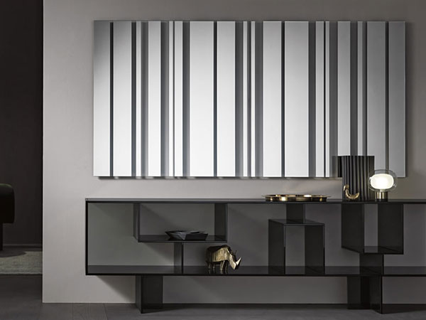 Wall mirror made of a glass panel with mirrored bands alternating with transparent bands.