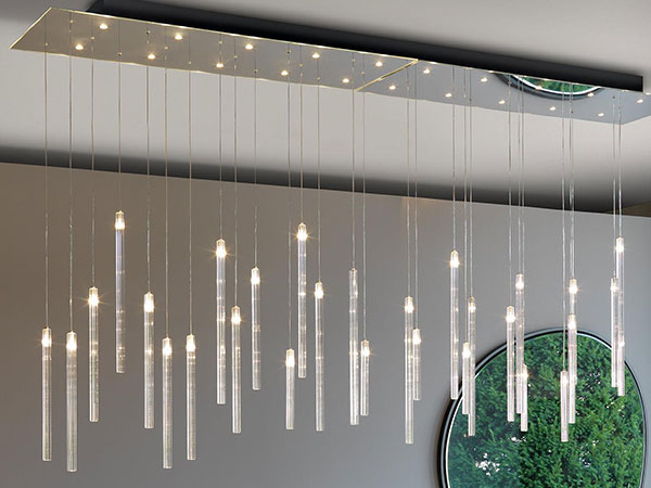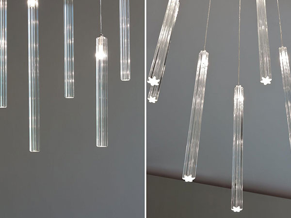 Lamp with ceiling plate in mirror glass with built-in LED. Pendant elements in solid transparent glass with LED. It is possible to realize customized versions for dimensions, length and shape.