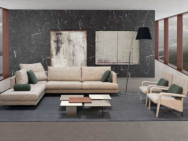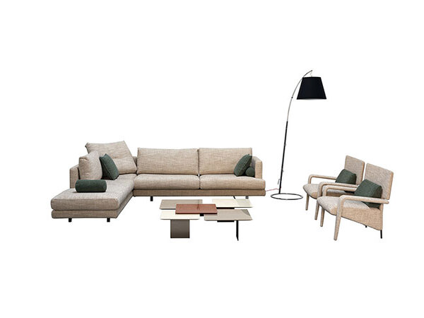 Metal frame padded in resilient polyurethane foam. Linear back cushions with inserts. The series includes: armchairs, two and three seat sofas, corner sectionals, chaise longue and ottoman.