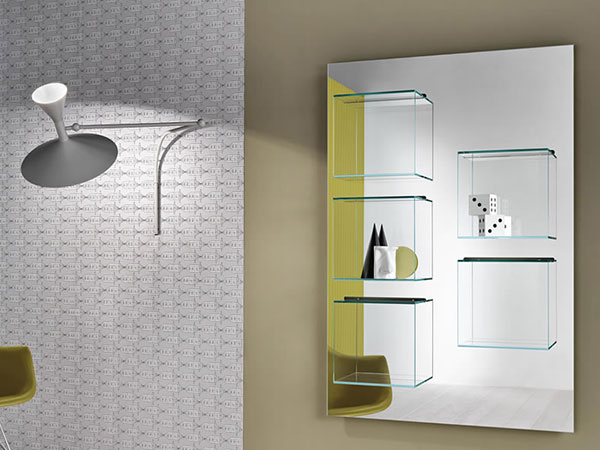 Wall mounted container in extra clear or transparent glass. In addition to the panel finishes in white, black or walnut canaletto, 3 new finishes in ceramic with marble effect. Noir Desir, arabesque Calacatta, Orobico grey.