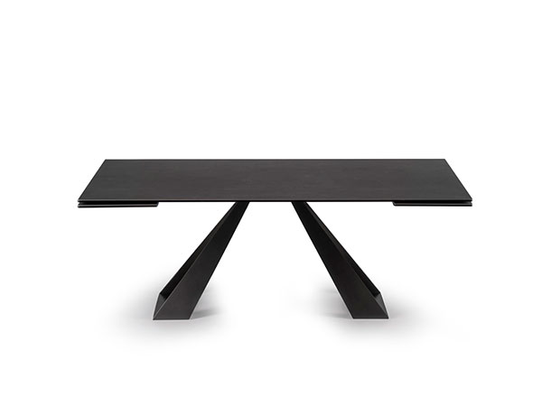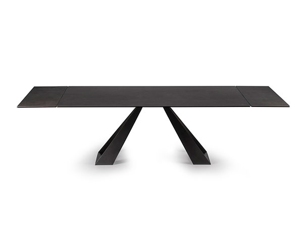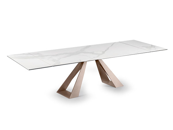 EXTENSIBLE DINING TABLE, WITH TOP AND EXTENSIONS OF GLASS. BASE AND TRACK OF PAINTED METAL. A VERY EASY PATENTED MECHANISM TO PULL OUT THE LATERAL EXTENSIONS ALLOWS THE WIDENING OF THE TOP OF CM 80. AVAILABE ALSO WITH CERAMICS TOPS.
