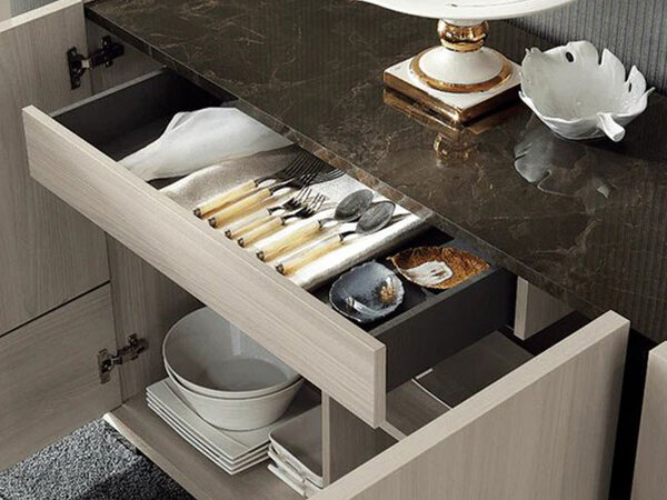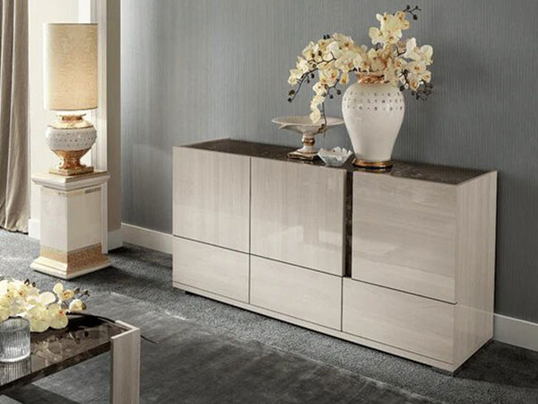The Doran Buffet collection exudes modern and confident elegance with its marbled stone top detailing and light elm high gloss stone finish. The opulent nature of this buffet adds a luxurious touch to your home decor. Crafted with light elm eco veneer and complemented with emperador high gloss stone finish, it offers a generous storage space with three doors. Make a modern statement with this unique and sophisticated buffet from the Teodora collection by Alf Italia.