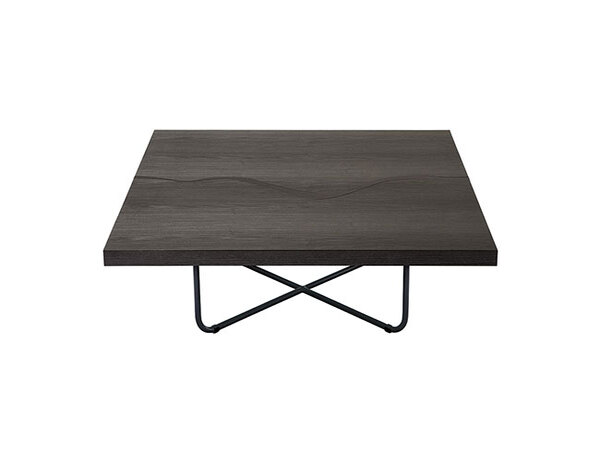 A collection of low tables, tables, desks and furniture featuring a wooden top with a laser-cut metal insert, and a metal base.
