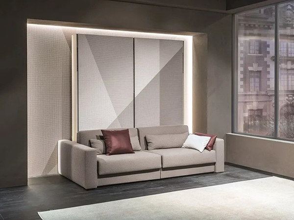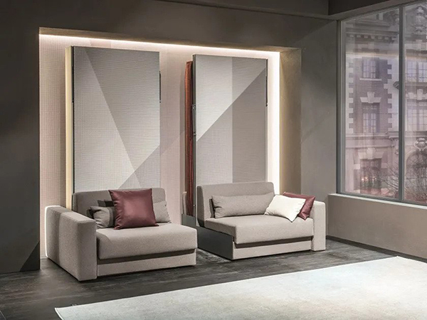 Ella & Louis is a self-supporting transformable system which integrates a fixed sofa (L. 216.4 cm) with a hide-away double bed with integrated pull-down option, enabling its division into two separable single beds and an armchair.