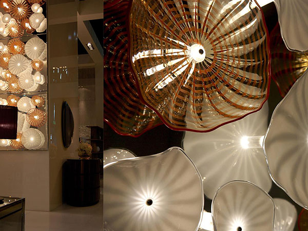 Decorative module in mirror glass 5 mm thick for installation to the wall or to the ceiling. White and iridium amber flowers elements in Murano glass with back LED lighting.