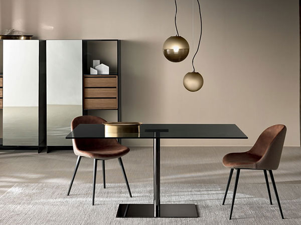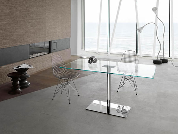 High table in tempered glass. Base in chromed metal. Available in three versions: square, round and rectangular. Size 90 x 90 x h 73 cm 110 x 110 x h 73 cm 130 x 70 x h 73 cm 150 x 80 x h 73 cm Ø 70 x h 73 cm Ø 90 x h 73 cm Ø 110 x h 73 cm Ø 120 x h 73 cm Thickness 12 mm Load 120 kg