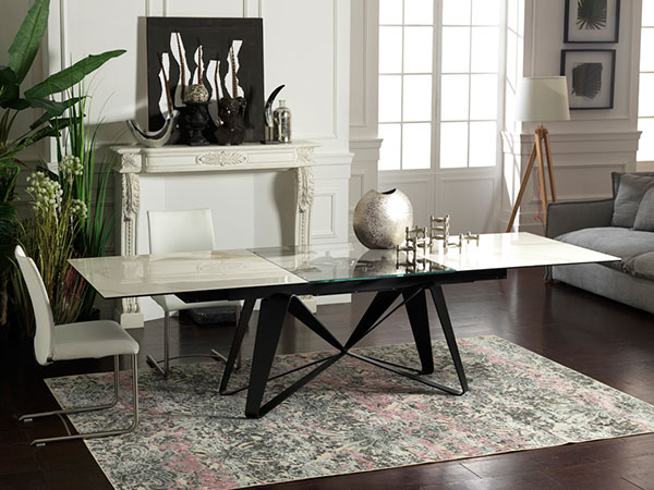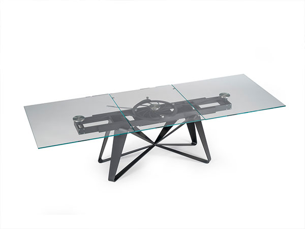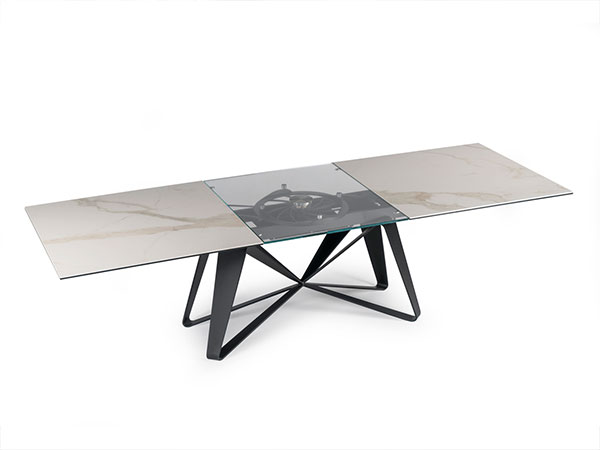 EXTENSIBLE DINING TABLE WITH GLASS OR WITH CERAMIC TOPS. LEGS IN PAINTED STEEL. EQUIPPED WITH A SYNCHRONIZED MECHANISM FOR LATERAL EXTENSIONS WIDENING AND CENTRAL EXTENSION LIFTING. AVAILABLE WITH OR WITHOUT REMOTE CONTROL.