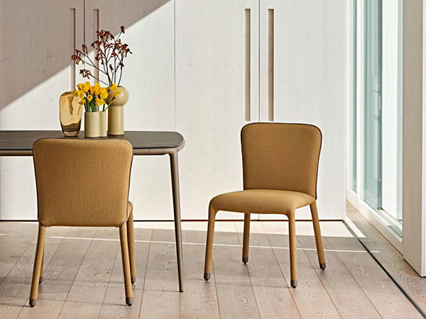 Gaius chair with four-leg base entirely upholstered in leather, faux leather or fabric. Piping in leather customizable in solid color or contrasting the upholstery Steel feet available in small or large version.