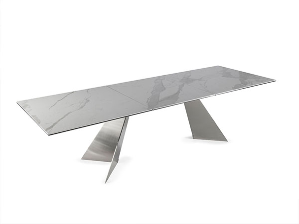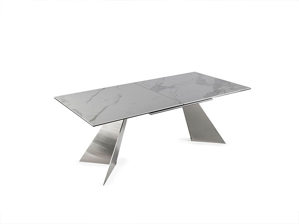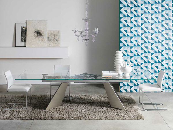 EXTENSIBLE DINING TABLE WITH GLASS OR CERAMIC TOPS. LEGS IN CHROMED OR PAINTED STEEL. EQUIPPED WITH A SYNCHRONIZED MECHANISM FOR LATERAL EXTENSIONS WIDENING AND CENTRAL EXTENSION LIFTING. AVAILABLE WITH OR WITHOUT REMOTE CONTROL. .