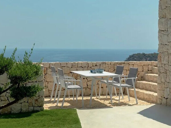 Aluminum frame and top for this elegant outdoor Ilo S table that perfectly matches with the Milo dining chairs to create a romantic, modern but timeless design.
