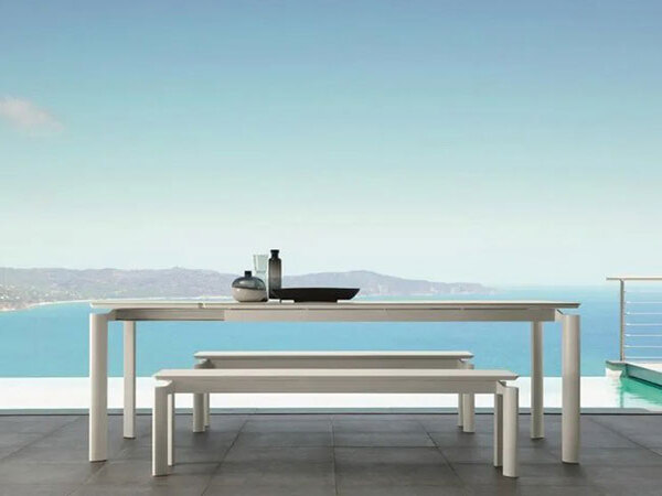 Extending garden table with a powder-coated aluminum frame available in three different colours and ceramic top. Dining table Ilo T 200x100cm made of ceramic with 60cm optional extension leaf available in white and dark grey.