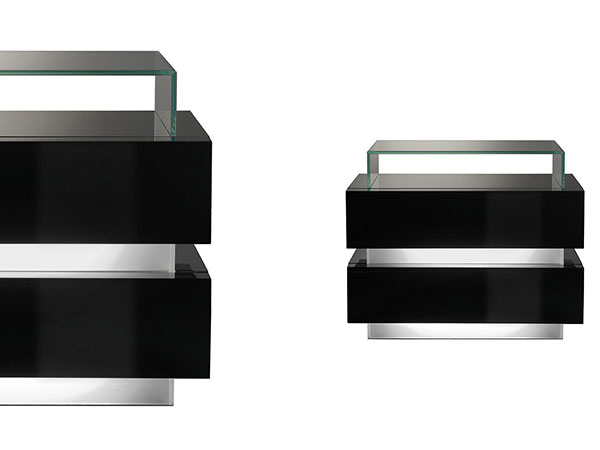 Nightstand in wood with dividing parts in extra clear etched and tempered glass with internal LED lighting or in satin Brass (104M) finish. Structure with 2 drawers available in shiny lacquered, Canaletto Walnut or in shiny Ebony. Top in lacquered glass for lacquered version. Optional top shelf in extra clear glass 10mm th. and additional drawers.