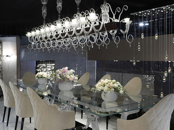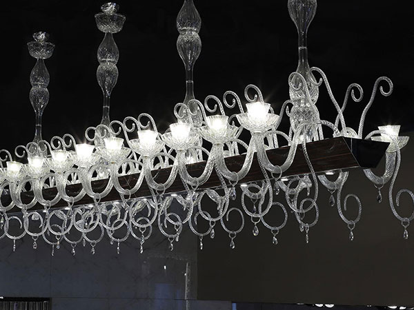 Modular chandelier composed by elements in engraved crystal and arms and pastorals in transparent Murano glass. Metal support covered in smoked mirror glass with Diamante engravings. Available in rectangular shape with 10 lights to be extend thanks to a connecting element with 2 lights or in round shape with 8 lights. Lighting system with Led bulbs