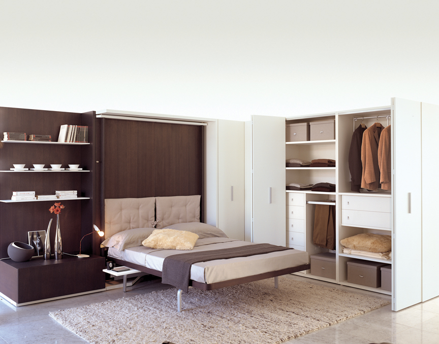 The LGM is a vertically opening queen bed that rotates 180 degrees to reveal a queen wall bed. Many wall finish and upholstery options available for this bed in a wall unit. The LGM wall bed is designed and made in Italy by Clei.