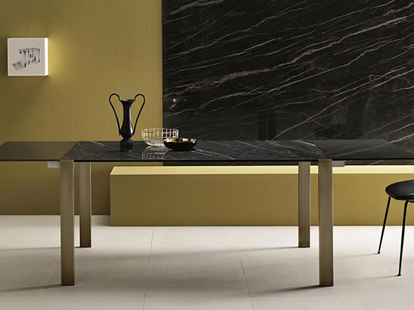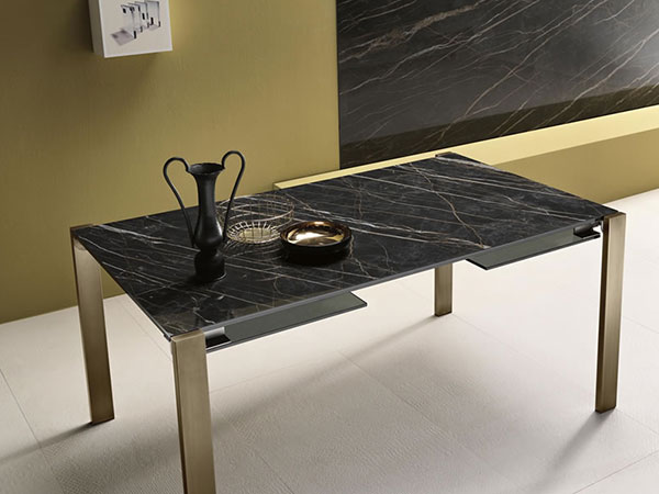 New finishes for the top, now available in ceramic+glass in 3 different polished marble effect finishes. Noir Desir, arabesque Calacatta, Orobico grey. Size 120/210 x 9 0x h74 cm 140/240 x 90 x h74 cm 160/260 x 90 x h74 cm 180/280 x 90 x h74 cm 100/170 x 70 x h74 cm 80/130 x 80 x h74 cm 120/170 x 80 x h74 cm 90/140 x 90 x h74 cm 120/170 x 90 xh74 cm Thickness 12 + 5 / 12 mm Load * 170 / ** 40 kg