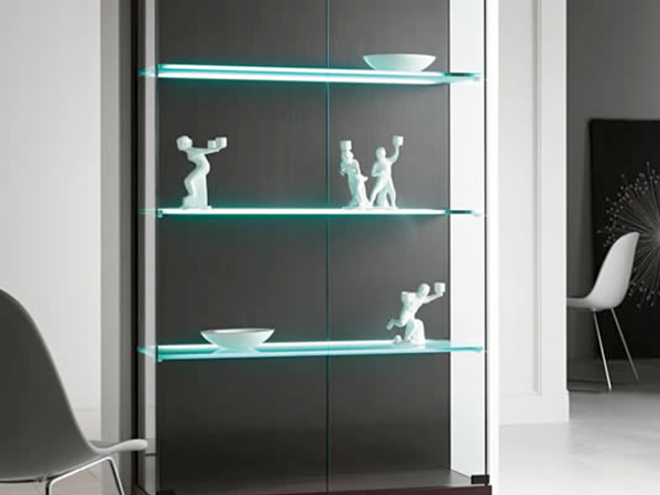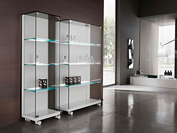 Glass and wood showcase, available in black or white mat lacquered, wengé or bleached oak.