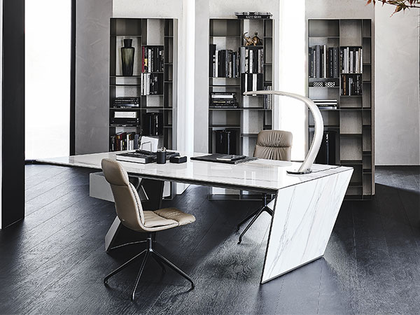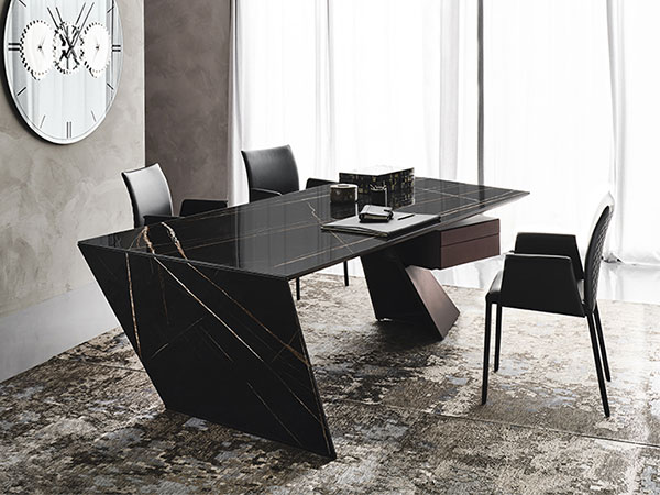 Desk in Marmi ceramic Calacatta (KM01), Alabastro (KM02), Ardesia (KM04), matt Golden Calacatta (KM05), glossy Golden Calacatta (KM06), matt Portoro (KM07), glossy Portoro (KM08), glossy Sahara Noir (KM09), Emperador (KM10), Makalu (KM11), Breccia (KM12) or Arenal (KM13) with insert in black chrome (06). Leg in graphite (GFM69), titanium (GFM11) or bronze (GFM18) embossed lacquered steel, structure and drawer unit embossed lacquered wood matching the color of the leg.