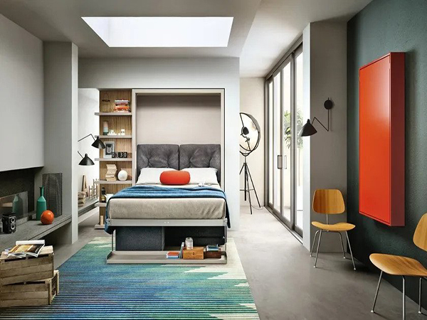 The sofa is produced in two versions, both of which have a pillow compartment underneath the seat part. The W 301 cm version features W 27 cm armrests, while the W 173 cm has W 6 cm armrests. Both the large section with 27 cm armrest and full W 173 sofa are perfectly aligned with the tilting transforming bed system positioned behind it. Opening the bed, automatically the seat slides forward and the backrest flattens out. Both the seat pad and backrest are made from non-deformable foam in differing densities and upholstered in polyethylene terephthalate resin. All covers can be removed. The model also features rectangular and oval loose cushions and a pouf which can be tucked away under the open bed