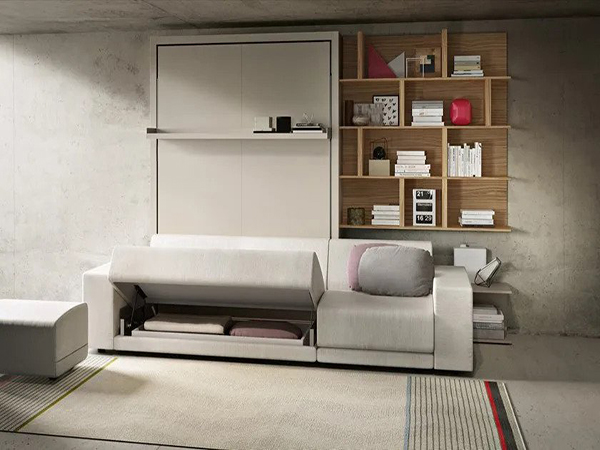 The sofa is produced in two versions, both of which have a pillow compartment underneath the seat part.‎ The W 301 cm version features W 27 cm armrests, while the W 173 cm has W 6 cm armrests.‎ Both the large section with 27 cm armrest and full W 173 sofa are perfectly aligned with the tilting transforming bed system positioned behind it.‎ Opening the bed, automatically the seat slides forward and the backrest flattens out.‎ Both the seat pad and backrest are made from non-deformable foam in differing densities and upholstered in polyethylene terephthalate resin.‎ All covers can be removed.‎ The model also features rectangular and oval loose cushions and a pouf which can be tucked away under the open bed