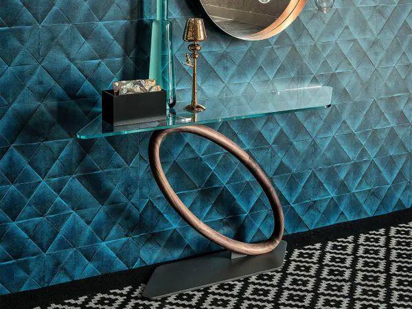 The Ours console table is a stunning work of art that can be fittingly placed where everyone gets to appreciate its presence. With a Canaletto walnut finished sculptural base that seemingly defies gravity with its orbital shape, the console is a must-have product. The wood or glass tabletop provides plenty of decor opportunities for a convenient touch.