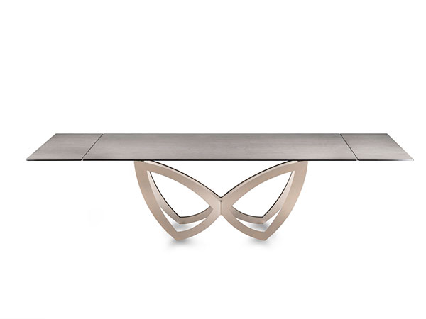 EXTENSIBLE DINING TABLE, WITH TOP AND EXTENSIONS OF GLASS. BASE AND TRACK OF CHROMED OR PAINTED METAL. A VERY EASY PATENTED MECHANISM TO PULL OUT THE LATERAL EXTENSIONS ALLOWS THE WIDENING OF THE TOP OF CM 80. AVAILABE ALSO WITH CERAMICS TOPS.