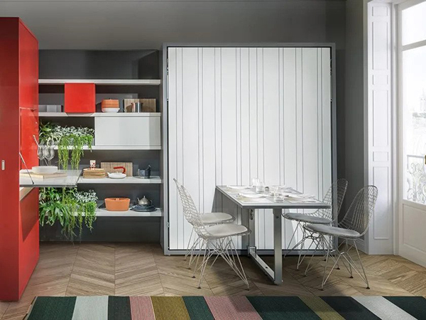 Penelope Dining is a double-function transforming system with a tilting double bed featuring the patented CF09 slatted bed base (W 166 cm x D 208,4 cm and mattress W 160 cm x D 198 cm), tilting opening with safety mechanism to stop accidental opening and closing.‎ Tilting mechanism through gas springs and device that cushions movements, completely contained in the side of the structure, thanks to patented technology and special manufacturing.‎ The model, which is produced with depths 35 cm (with fabric bed headboard) or 62,3 cm (with wooden bed headboard, pillow compartment and shelves), is available in the Standard, Dining (table), Board (large desk), Sofa versions.‎ In the Dining version, Penelope 2 features a mechanised table (W 70 cm x D 120 cm x H 72 cm) which can perform a series of specific functions: tilting opening for the table function, vertical closing flushing against the wall to free up space and pivot function to enable it to be stored under the bedframe in the night-time position.‎
