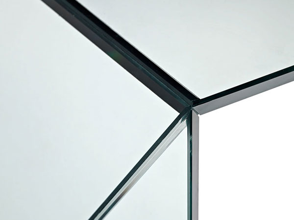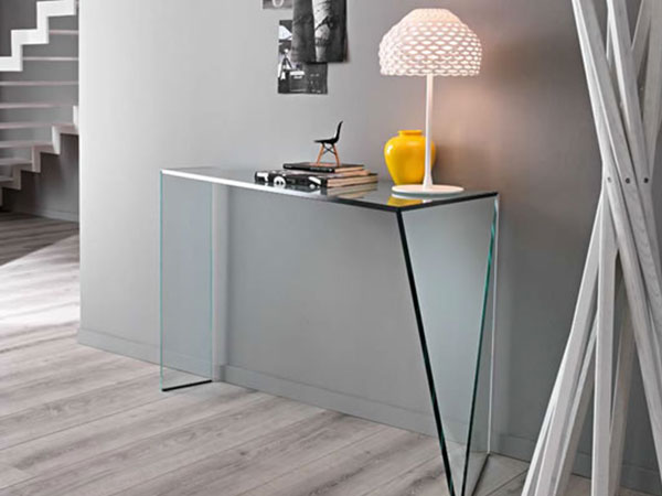 Glass consolle, practical and essential. Original and asymmetrical shape with oblique welding on the side.