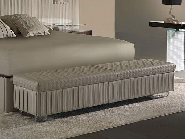 Bench with storage and upholstery available in fabric Extra Amsterdam, velvet or leather cat.C, Nabuk, Colorata with San Marco quilting. Sphere-legs in transparent, gold, black, blue-grey, amber, red, amethyst, tobacco Murano glass. Optional LED lighting for the legs.