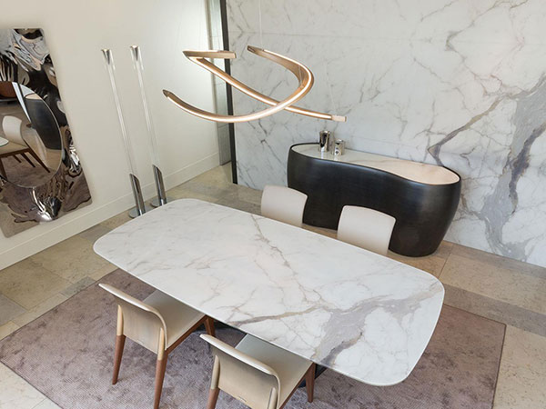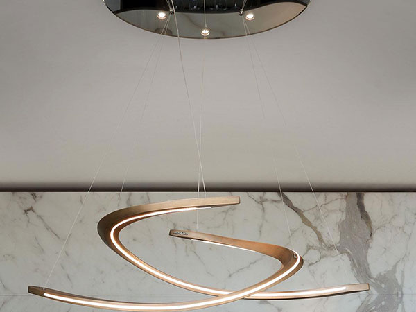 Lamp with oval mirror glass support with built-in LED and closing frame. 2 pendant curved elements in satin finish: brass, dark brass, titanium, dark titanium, with LED strip.