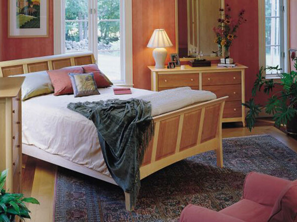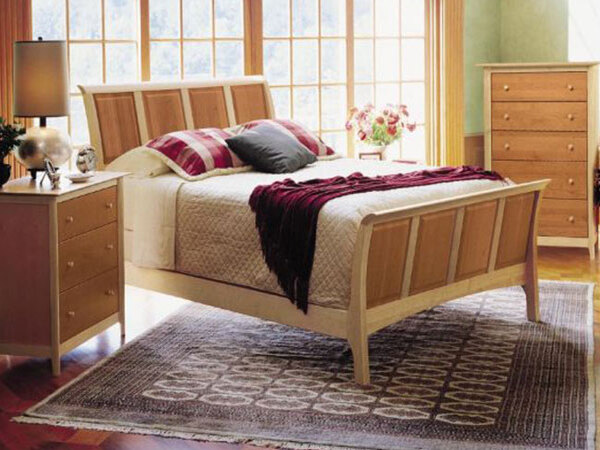 The Sabah H bed with low footboard is designed for use with a mattress only. The bed is made of solid cherry hardwood and Made to Order in several finishes. The Sabah H bed is also crafted in a combination of solid cherry and maple. The finish is GREENGUARD Certified for low chemical emissions.