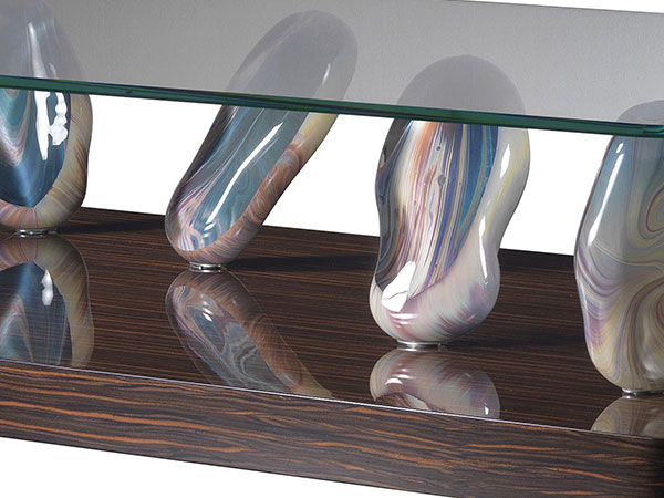 Coffee table with base in shiny lacquered wood or in shiny ebony wood 80 mm thick with rounded corners. 6 legs in Murano glass in Calcedonio or amber colour. Top in extra-clear glass 12mm thick with 45° bevel and rounded corners R50mm