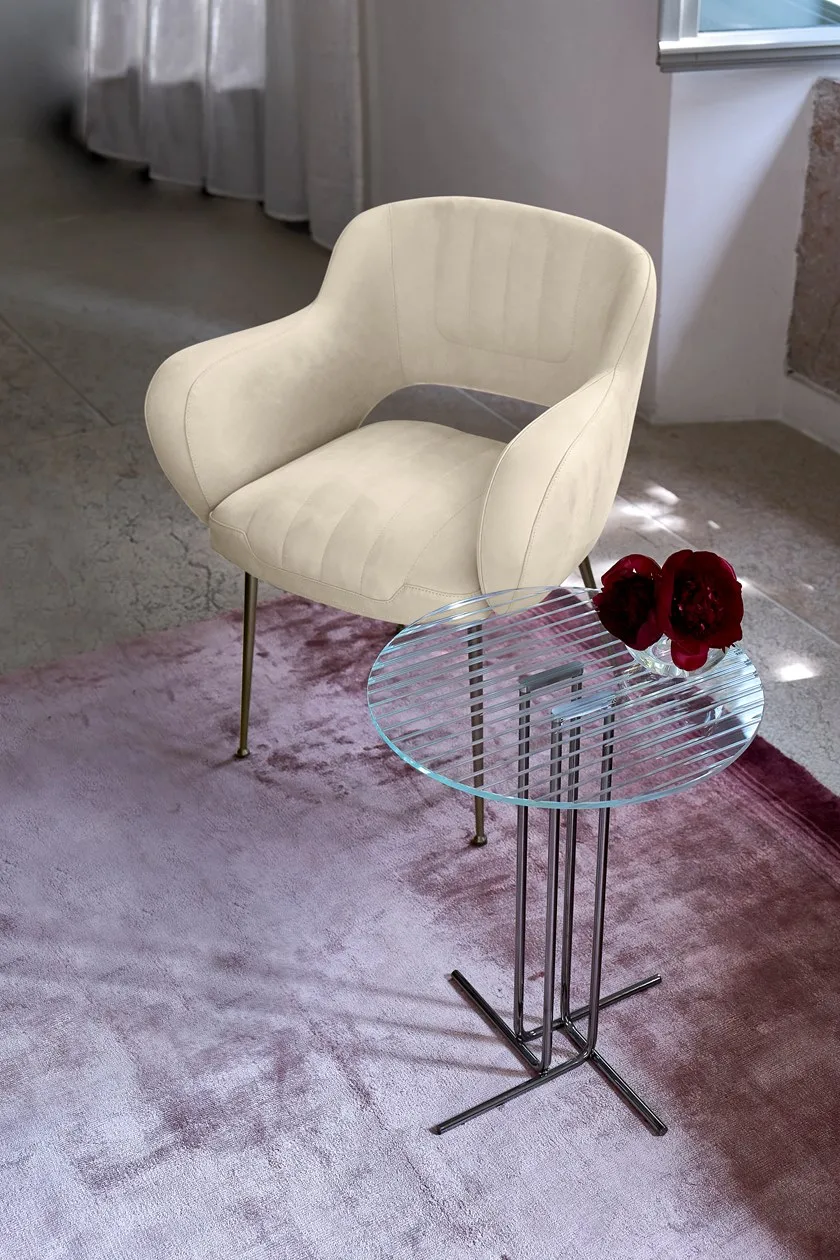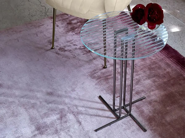Sey side table’s purpose is to bring out a room’s style, to make shapes fall into place, to even a book, whatever the answer for its purpose. Here we have a laser designed and cut glass that provides a totally perfect lineature to any fixture in a living space. Again, it is contrasted with geometric shapes, long legs and form to bring out balance in what is Sey’s piece of style and design. This side table has metal base with finishes in black nickel or varnished micaceous brown and extra-light engraved transparent glass top.