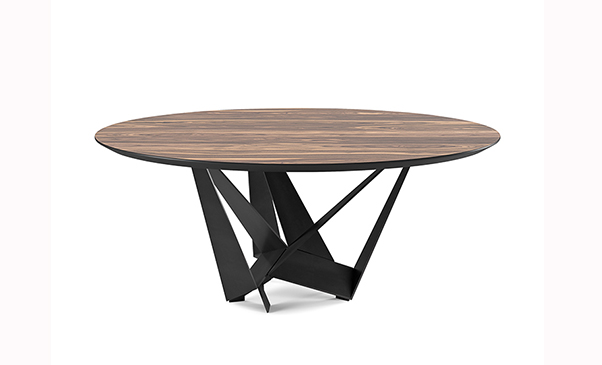 Skoro Round dining table comes with a high degree of customization. The top is available in various wood finishes as well as in 15mm clear or extra clear glass with beveled edges, while the base comes in different metal options.