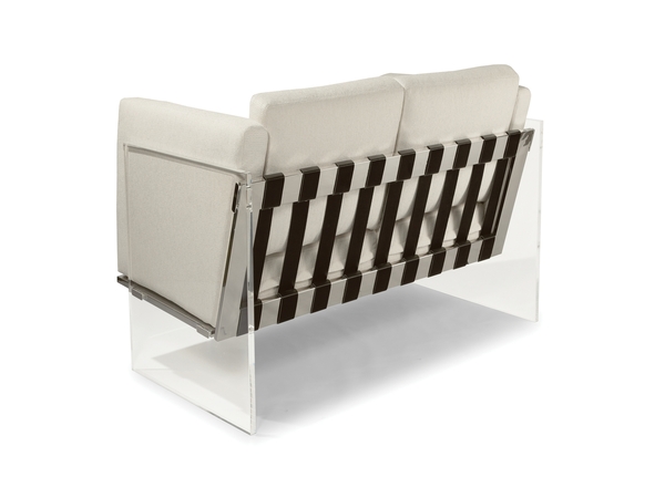 The Smarte studio sofa seemingly floats on air. Striking from all angles, our Get Smarte sofa features clear acrylic arm panels, stainless steel rails and black leather strapping standard. Companion lounge chairs and standard sofa are also available. Select from our many fabrics or leathers or provide COM.