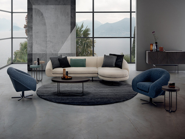 Strike is inspired by a symbol taking shape, like a knot in a ribbon. A well-rounded collection: an oval-shaped armrest forms the genesis for the backrest. The soft, eye-catching lines are welcoming and comfortable with an incredibly cosy yet creative look. The grandeur of the padding is a perfect match for the lightness of the metal base that embellishes the entire project. The collection includes a sofa, pouffe, chair, stool, and an armchair designed with a swivel or fixed base.