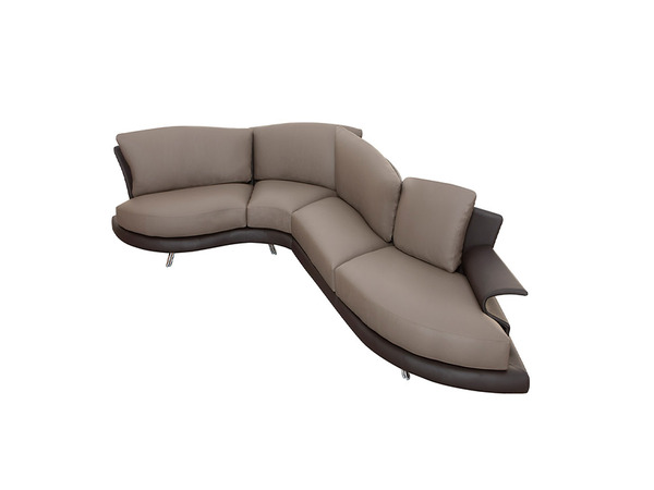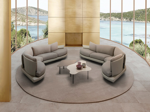 Compositions and sizes on request with the addition of a shaped chaise longue. Metal structure padded with non-deformable urethane rubber. Curved overlapping backrests, with two different depths for different seating comfort. The diagonal cut of the seat cushions connects with the particular shape of the back cushions.