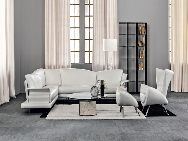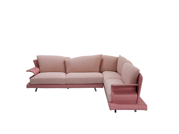 Super L sofa with curved overlapping backrests at two different depths for different seating comfort. The diagonal cut of the seat cushions connects with the particular shape of the back cushions.