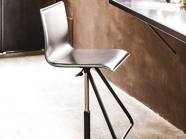 Swiveling ultralight stool, adjustable in height with 4 spokes base in polished aluminium and column, footrest and gas piston in chromed steel (08) or with base plate, column, and footrest in black (GFM73) or titanium (GFM11) embossed lacquered steel and gas piston in chromed steel (08). Frame covered in leather as per sample card. Standard or in contrast stitching.