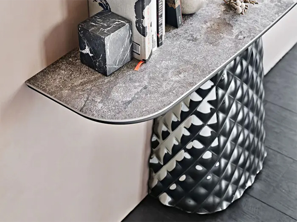 The unprecedented Trium console table makes an unmissable addition to a contemporary home. The base of this console is abundantly high fashion, crafted with a unique, attentive technique that shapes its mirror glass makeup into that quilted fabric look. Equally elegant is the ceramic top that brings great utility alongside its natural beauty. Decorate with clocks and lamps and keep some reading materials on display with the convenient space.