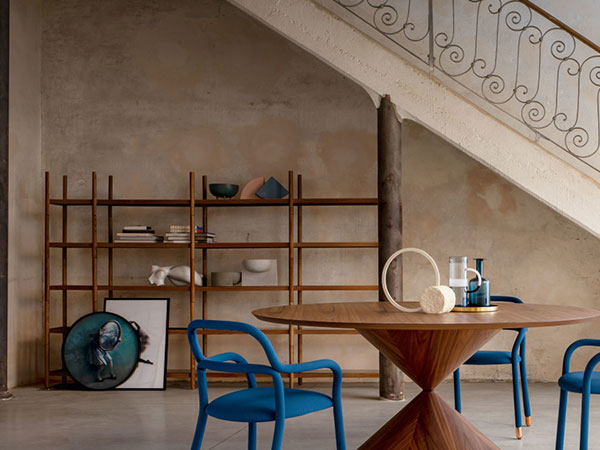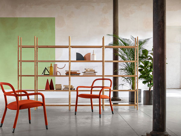 Valentina modular bookcase with wooden structure and glass or metal shelves.