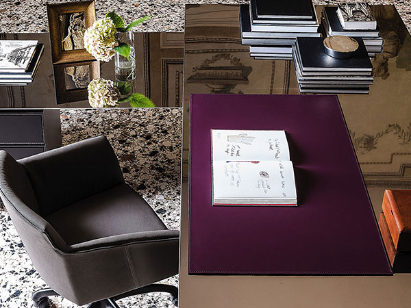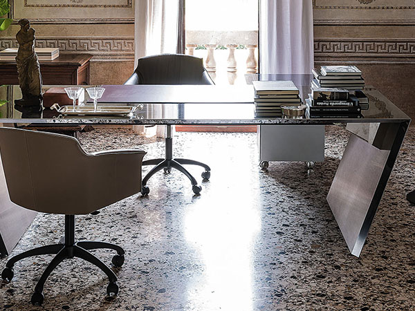 Desk in polished stainless steel or covered in Canaletto walnut (NC) or burned oak (RB) with inner sides painted in matt graphite (OP69). Optional accessories: peninsula in the same finish as the desk (to be supported by drawer-unit), two-drawer-unit on wheels with graphite (OP69) lacquered structure and front part of the drawers in leather as per sample card, pad in leather as per sample card. Small reflection irregularities on the desk in polished stainless steel version are due to manual processing.