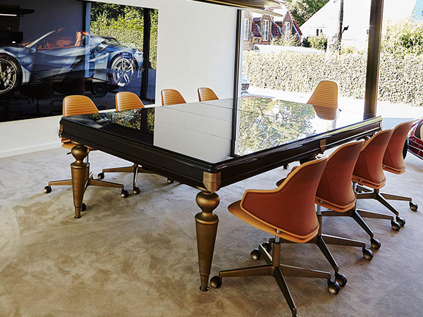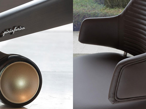 Chair low-back with shell in resin and wood, upholstery in leather or fabric and quilting on the back. Base in polished aluminium or in brass or dark brass satin finish with pump to adjust the height and with wheels.