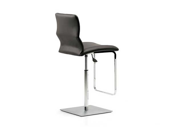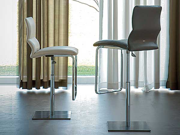 Swiveling stool, adjustable in height with satin stainless steel base plate and column, footrest and gas piston in chromed steel (08) or with base plate, column, and footrest in black (GFM73) embossed lacquered steel and gas piston in chromed steel (08). Seat covered in fabric, synthetic nubuck, micro nubuck, synthetic leather, or soft leather as per sample card. Round base on demand.