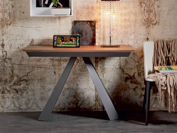 The Vivium extension console table was designed to resolve two lifestyle dilemmas. First, the Vivium console is a solution for small modern living spaces where most furniture has double duties. Second, it was designed to serve as an additional surface during large home parties in conjunction with the main dining table. Extending the table is simple by turning it to the side and pulling from either end to make space for the leaves that are stored separately. In addition to being practical, it is also stylish with a sculptural base that stands out in style.